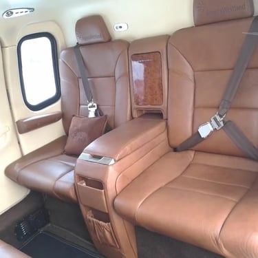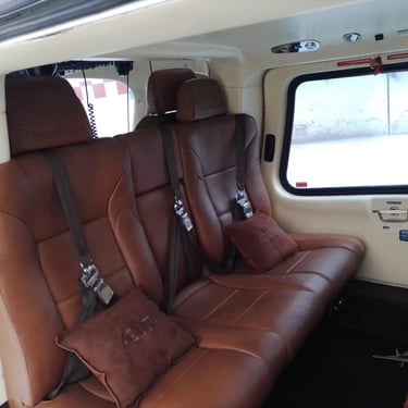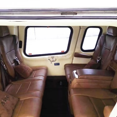 Número de Asientos 7, Aislamiento Acústico, Asientos corporativos de cuero marrón para 7 personas (2+3+2). Cabina insonorizada con revestimiento de techo, ventilas de aire ajustables en la parte superior, luces de lectura y paneles de tapicería.