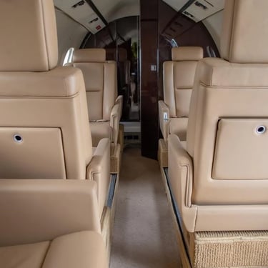 5 asientos ejecutivos y un diván doble, con tapicería de cuero beige, alfombra de color claro, revestimiento interior color marfil y gabinetes o madera en tono claro.